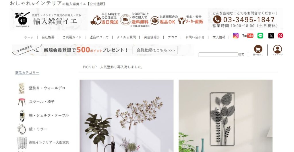 輸入雑貨イエでは新規会員登録で500ポイントもらえます。